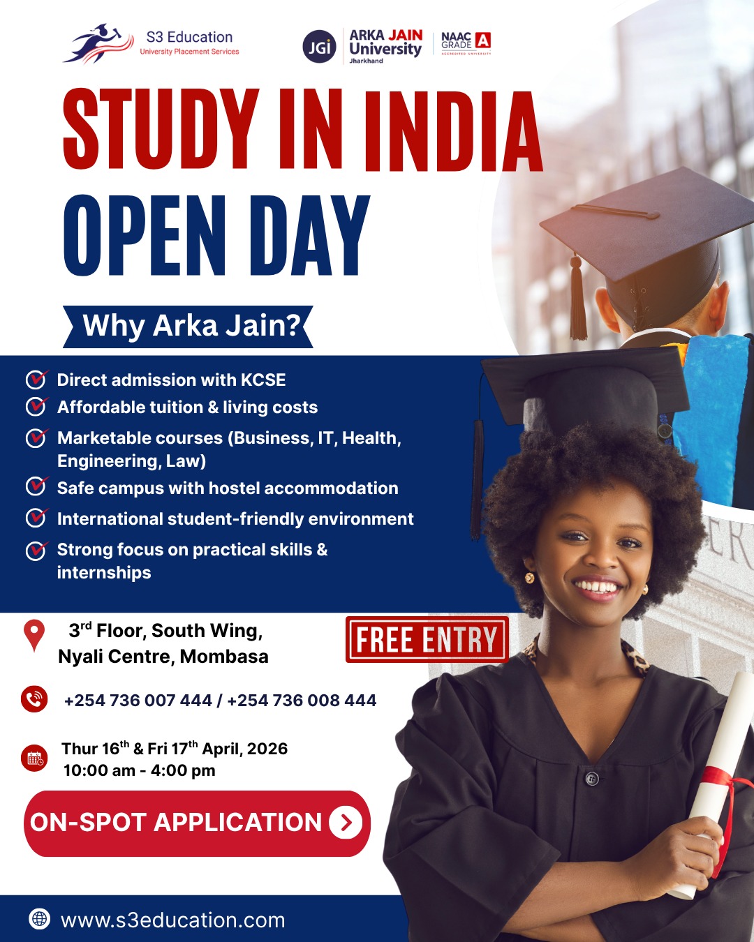 S3 Education – University Placement Services invites you to the Arka Jain University Open Day in Mombasa. Discover affordable study options in India and explore career-focused programs designed to prepare you for the global job market. Entry is free, with on-spot application support available.
